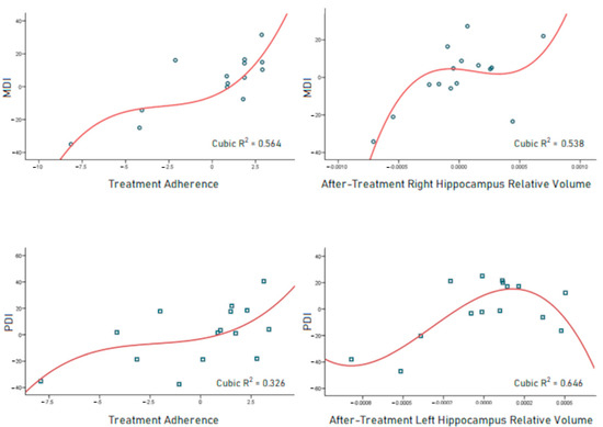 Hierarchical regressions were performed to assess the predictability of the neurodevelopment indices, MDI, and PDI. The best model obtained to predict MDI (R2 = 0.598, p = 0.004) included treatment adherence and the relative volume of the right hippocampus. For PDI, the best model (R2 = 0.543, p = 0.009) used treatment adherence and the relative volume of the left hippocampus as predictors (Table 4).