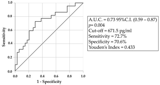 Subsequently, we investigated the diagnostic accuracy of CSF NF-L to discriminate L-M from U-M. ROC curves showed a significant fair ability of CSF NF-L to discriminate U-M from L-M (A.U.C. = 0.73 C.I.95% (0.590–0.865), p = 0.004). The best cut-off for NF-L to distinguish between L-M from U-M, calculated on the basis of Youden’s index, was 671.5 pg/mL, with a sensitivity of 72.7% and a specificity of 70.8% (Figure 2).