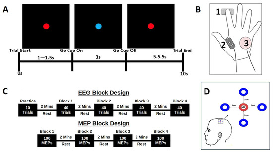 - Leocani, L.; Cohen, L.G.; Wassermann, E.M.; Ikoma, K.; Hallett, M. Human corticospinal excitability evaluated with transcranial magnetic stimulation during different reaction time paradigms. Brain 2000, 123, 1161–1173. [Google Scholar] [CrossRef]