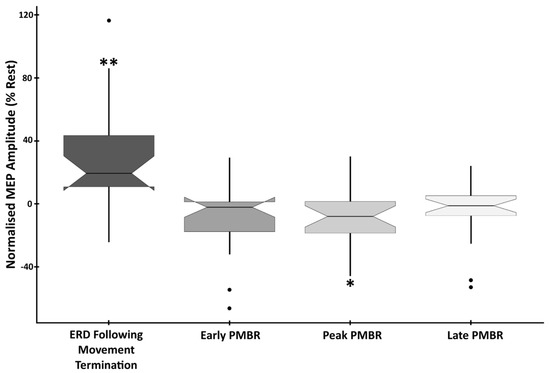 EMG Amplitude at beta-change time-points showing the difference from baseline in the mean peak-to-peak amplitude of MEPs induced during the four beta-change time-points. Data are normalised to the rest period, with statistically significant differences denoted as follows: ** p < 0.01; * p < 0.05.