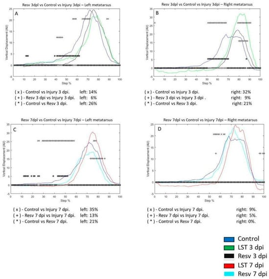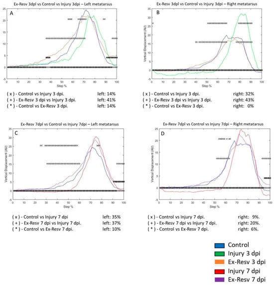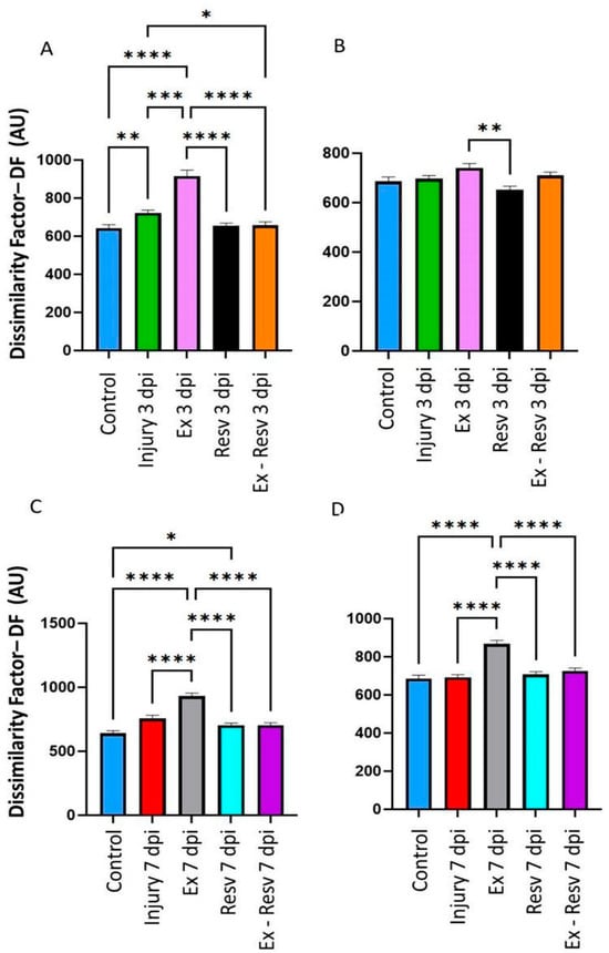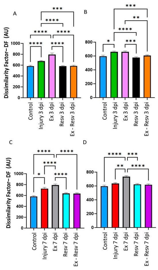 3.1. Dissimilarity Factor (DF) in the Left and Right Metatarsus on the Third and Seventh Days Post-Injury with Resveratrol and Exercise