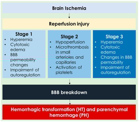 The progression of an ischemic stroke typically occurs in three stages. The first stage, known as the acute phase, lasts up to 48 h after the stroke begins and is marked by a lack of oxygen, which triggers the excessive release of glutamate. This leads to widespread excitotoxicity, causing significant neuronal damage. When blood flow is restored—either naturally or through medical intervention—it can result in reperfusion injury, which may further harm brain tissue. During reperfusion, activated glial cells, injured neurons, and other elements of the neurovascular unit release a mix of substances, including growth factors, matrix metalloproteinases, reactive oxygen species, glutamate, nitric oxide (NO), and cytokines. These molecules contribute to post-injury processes like angiogenesis, breakdown of the blood–brain barrier (BBB), degradation of the basement membrane (BM), glial activation, and neurotoxicity. Moreover, peripheral immune cells infiltrate the brain, collaborating with activated glial cells to foster a pro-inflammatory environment [103,104,105,106,107]. The general features of reperfusion injury are illustrated in Figure 1.