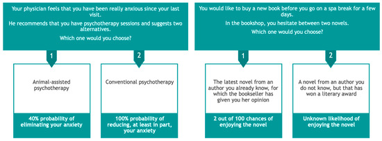 Example of scenarios: on the left, under risk—in this example, the scenario involves a small gain (partially reducing anxiety) versus a larger gain (eliminating anxiety), and on the right, under ambiguity—in this example, the scenario involves an unambiguous small gain versus an uncertain outcome.