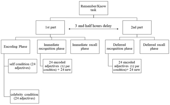 Episodic memory was measured using a recognition task inspired by the study by [36] in which states of consciousness associated with the retrieval of items, or in other words, the processes used, recollection and familiarity, respectively, were assessed by the recalled details from the encoding context. Ninety-six adjectives were selected and organised into 4 lists of 24 words each. In each list, half of the adjectives had a positive and the other half a negative valence. The four lists were similar in terms of frequency, number of letters and number of syllables. The task was divided into two parts, consisting of three and two phases, respectively (see Figure 2). During the first part, the encoding phase started once the instructions and examples had been presented. Two conditions were presented one after the other: self and celebrity condition. We used these two conditions to ensure deep encoding. In the self-condition, participants had to decide whether the adjectives presented on the screen corresponded to their personality or not. The question “Are you?” was written on the top of the screen, and the adjectives were presented in the centre, one after the other. When the experiment was conducted in the presence of the experimenter (i.e., for the older adults), the participants answered “yes” by pressing the “l” key labelled with a blue sticker and “no” by pressing the “s” key labelled with a red sticker. In remote mode (i.e., for the young adults), the participants answered “yes” by pressing the “2” key and “no” by pressing the “1” key, both on the main keyboard. The next adjective appeared once one of the two answer keys had been pressed. The adjectives, which were written in French, agreed with the participant’s gender (i.e., feminine vs. masculine). In the celebrity condition, the same procedure was followed and differed only in that instead of answering the question “Are you?” the participants had to answer for a celebrity. For the older adults group, the target celebrities were “Catherine Deneuve” and “Michel Sardou”, i.e., a French actress and a French singer. For the young adults group, the celebrities were “Marion Cotillard” and “Jean Dujardin”, i.e., a younger French actress and French actor. Twenty-four adjectives were presented for each condition, meaning that 48 adjectives were encoded in total. Directly after the encoding phase, the participants had to perform a retrieval phase. Forty-eight adjectives were presented one after the other. Of these, 24 had been presented during the encoding phase (i.e., 12 per encoding condition, self and celebrity), and 24 were new. The participants had to answer the question, “Have you already seen this adjective?”. The same response keys as for the encoding phase were used to answer yes or no. If the answer was “no”, the adjective disappeared, and the next one was displayed on the screen. However, if the answer was “yes”, the participant was tested further to determine whether this answer was given on the basis of the familiarity or recollection process. Inspired by studies by [36], we decided to ask participants to answer the following three questions rather than asking them to answer ‘remember’ or ‘know’: (A) What question did this adjective follow?: (1) Are you?, (2) Marion Cotillard (e.g.,) is?, (3) I don’t remember; (B) What did you answer?: (1) yes, (2) no, (3) I don’t remember; and (C) Reading this adjective, did you have: (1) an image or memory in mind, or a particular feeling?, (2) none of these, (3) I don’t remember. If the participants answered C.1., a text area appeared in which the participants were asked to describe their image/memory/feeling. If the participants answered “I don’t know” for the three complementary questions, the recognition was considered based on the familiarity process. If the participants had at least one precise memory of the encoding phase (i.e., the condition, the answer, the image/memory/feeling), the recognition was considered based on the recollection process. Once the recognition list had been completed, a free recall phase started. The participants were instructed to recall as many of the presented words (i.e., from the encoding phase and the new words) in a maximum of five minutes. The older adults spoke the adjectives aloud, and the experimenter wrote them down. The young adults saw a special text area in which they could type the recalled adjectives by themselves. The second part of the task took place three-and-a-half hours later. This started with a delayed recognition phase and used the 24 encoded words (i.e., 12 per condition) not displayed during the immediate retrieval phase, together with 24 new adjectives. The same procedure was followed as in the first recognition phase. Once the 48 adjectives had been presented, a delayed recall phase started. The participants were asked to give the maximum number of adjectives they could remember from both parts of the task taken together.