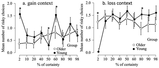 The average number of risky options chosen in gain (a) and loss (b) scenarios as a function of the certainty percentage of those options. Errors bars indicate standard errors. The stars indicate significant comparisons * p < 0.001, except 50% in gain context when p is < 0.002.