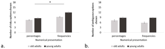 Finally, the ANOVA, including the numerical information factor (frequency, percentage), showed a significant simple effect of numerical presentation (F(1, 58) = 26.0, p < 0.001, η2 = 0.214), with more risks being taken when the information was presented in frequencies (see Figure 4a). No numerical presentation*group interaction effect appeared (F(1, 58) = 2.4, p = 0.127, η2 = 0.020).