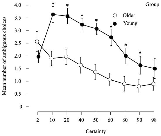 A repeated-measures ANOVA was performed to investigate the effect of the percentage of certainty on the number of ambiguous choices. A significant simple effect of percentage of certainty (F(1, 58) = 34.9, p < 0.001, η2p = 0.375), a significant simple effect of group (F(1, 58) = 51.6, p < 0.001, η2p = 0.469) and a significant percentage of certainty*group interaction effect (F(1, 58) = 13.6, p < 0.001, η2 = 0.191) were observed (Figure 5). The planned comparisons, with Bonferroni correction, showed that older adults selected significantly fewer ambiguous options than young adults for all percentages of certainty (all p < 0.001) except 2% and 98% of certainty.