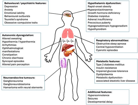 The aetiology of metabolic features that may occur is poorly understood and is a management variable. Glucose dysregulation and progression to type 2 diabetes mellitus have been reported, and continuous glucose monitoring (CGM) may be useful in order to characterise early dysglycaemia [58]. Treatment with metformin, insulin or GLP-1 receptor agonists has been used with variable effects on glucose control, with reports of hypoglycaemia [58,65]. The mechanism of glucose dysregulation and diabetes in these patients is unclear, possibly related to the characteristic hypothalamic or autonomic dysfunction or even the profound obesity [83].