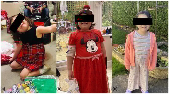 Rapid onset of obesity is usually the first identified feature, in a previously well child [4,8], associated with hyperphagia. The median age of onset of weight gain reported from a case series of 43 patients was 3.1 years [1]. This weight gain is often extreme, for instance, 6–10 kg in 6–12 months [12]; however, the actual extent of weight gain is often difficult to quantify due to the lack of routine childhood weight surveillance. Photographic evidence provided by families may support identification of the degree of weight gain (Figure 2). Patients may be misdiagnosed initially with nutritional obesity or presumed to have other syndromes associated with early onset of obesity, such as Prader–Willi syndrome [4,7,16], Bardet–Beidl [5], Smith–Magenis syndrome [18], or HIDEA syndrome [13].