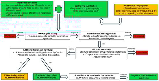 Ize-Ludlow et al. proposed criteria for the diagnosis of ROHHAD syndrome when naming the condition in 2007, which included the presence of alveolar hypoventilation after the age of 2 years and evidence of hypothalamic dysfunction as defined by more than one of the following: rapid-onset obesity, hyperprolactinaemia, central hypothyroidism, disordered water balance, failed growth hormone stimulation, corticotropin deficiency, or delayed/precocious puberty [4]. The possibility of a checklist to be utilised in children with rapid-onset obesity and symptoms suggestive of the syndrome has been proposed in order to facilitate earlier diagnosis [12]. A diagnostic algorithm is shown in Figure 4.