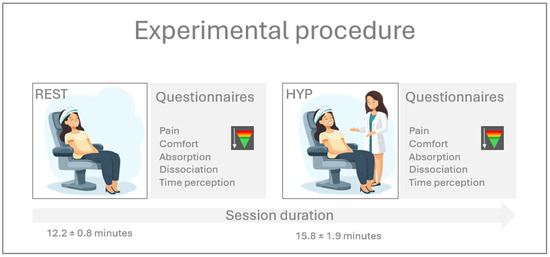 After both conditions (REST and HYP), numerical rating scales were used to assess the levels of pain (0 = no pain at all, 10 = worst imaginable pain), comfort (0 = no comfort at all, 10 = complete comfort), absorption (0 = not absorbed at all, 10 = fully absorbed in the experience), and dissociation (0 = to be in reality, in this room, 10 = to fully be disconnected from the here-and-now reality). Time perception was also gathered with an open-ended question, where participants were asked to estimate the duration of conditions (Figure 1). Questionnaires related to absorption, dissociation, and time perception were shown to be a good indicator to characterize the subjective experience of hypnosis in healthy volunteers [29]. In addition, these questionnaires have been used in several peer-reviewed studies related to nonordinary states of consciousness [30,31,32,33]. All recordings were carried out in the morning.