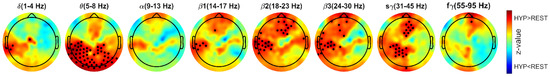 The difference in absolute band power between HYP and REST is illustrated in Figure 3. Total band power in the δ band during HYP was higher in the left temporal electrode. θ band power is increased significantly in the posterior electrodes during HYP, as compared to the resting state. No significant changes were observed in the α band. The β band power increased in the left and mid frontal and parietal electrodes during HYP. The band power in the sγ band significantly increased in the mid-frontal and left posterior electrodes during HYP. One electrode in the mid-frontal region showed increased fγ activity during HYP, as compared to REST.