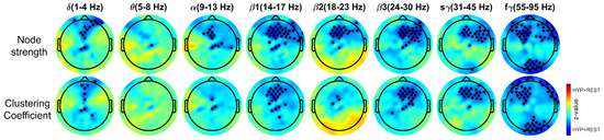 Functional connectivity estimated using pairwise-phase consistency is shown in Figure 4. A significant decrease in anterior region electrode connectivity was observed during HYP across all bands. The anterior to posterior connectivity decreased during HYP, as compared to REST. Decreased anterior-to-posterior midline connectivity was observed in all bands except the δ band. In the β band, decreased connectivity was observed between the temporal and frontal electrodes. Increased connections were observed laterally between the left temporal, right temporal, and occipital electrodes in α band. Decreased connectivity was observed between the anterior left and posterior right electrodes in fγ band. The node strength and clustering coefficient were estimated to characterize functional connectivity (Figure 5). Node strength significantly decreased during HYP in the mid-frontal region electrodes in all bands except the θ band and right frontal electrodes in the β and γ bands. Similar observations were made in the clustering coefficient measure except in the α and β2 bands.