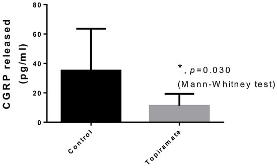 - Durham, P.L.; Niemann, C.; Cady, R. Repression of Stimulated Calcitonin Gene-Related Peptide Secretion by Topiramate. Headache 2006, 46, 1291–1295. [Google Scholar] [CrossRef]