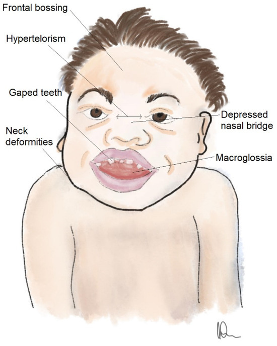 The degree of skull and facial dysmorphia varies not only between types of MPS but also between subtypes. Usually, patients are characterized by bossing of the frontal bone, retrusion of the midface, a deep cranial fossa that narrows the nasopharynx, and a flattened nasal bridge [Figure 1]. Patients with MPS suffer from small nasal passages due to thick mucus membranes, irregular development of facial bones, and increased secretions. Oral abnormalities include thickening of the lips, macroglossia, high-arched palate, and malocclusion traits, caused by dental irregularities and defects of the mandibular condyle. The eruption of some teeth is delayed. Patients with MPS are characterized by supernumerary teeth, taurodontism, root dilaceration, and impacted teeth [45,46,47]. Teeth are usually small, and spaces between them are broad due to the gingival overgrowth. According to panoramic radiograph studies among patients with MPS, one of the most common maxillomandibular alterations are dentigerous cysts [48,49]. This kind of cyst is usually asymptomatic but may lead to resorption of the tooth and bone [48]. The alveolar ridges may be flattered or enlarged. Patients may also suffer from different enamel defects. Dental and oral abnormalities have not only aesthetic consequences but also affect chewing and quality of life [45]. Macrocrania is usually noticed before the first birthday in patients with MPS types I, II, III, IV, VI, and VII. In MPS I, facial dysmorphia may be visible from six months old, in types II and VI between 9 and 18 months, whereas in MPS III it is visible starting at two years old [50,51].