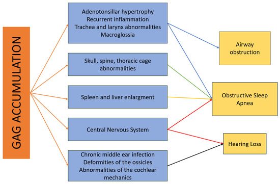 Although obstructive sleep-disordered breathing (OSDB) is a symptom of various problems in patients with MPS, it requires special consideration of ENT doctors and pediatricians. OSDB may occur as a simple snoring to obstructive sleep apnea syndrome (OSA) [31]. The pathogenetic mechanism of OSA is based on the anatomical constriction of upper airways and dynamic alterations occurring during sleep, which involve increased airflow resistance, muscle relaxation, and a heightened likelihood of obstruction in an already narrowed air passage. Usually, patients with OSA are characterized by snoring, mouth breathing, non-restorative sleep, and apnea [32]. OSA may affect up to 89% of patients with MPS [26,32,33]. OSA affects patients with MPS III the least. Apnea index is significantly higher in children than in adults (p = 0.03) [34,74]. In addition to adenotonsillar hypertrophy, larynx, and trachea abnormalities, OSA may be caused by spleen and liver enlargement, which limits diaphragm excursion. Furthermore, the shape of the chest wall is deformed due to kyphoscoliosis and pectus carinatum, which affects pulmonary function [75]. Cervical spine instability and odontoid dysplasia may compress the spinal cord and, as a consequence, may induce central sleep apnea [76]. Patients from the general population with OSA may develop learning difficulties, behavioral problems, and cardio-respiratory failure. Patients with MPS may experience these problems independently of OSA, but the presence of OSA may exacerbate them [33]. All patients with a diagnosis of MPS need a polysomnography examination, even before obstructive symptoms [32,35,71]. As the first line of treatment, ENT doctors suggest the removal of the obstruction by surgery [63,69]. If local surgical airway procedures are insufficient, continuous positive airway pressure (CPAP) may be implemented. Unfortunately, CPAP is less beneficial for patients with behavioral disturbances or in progression of airway disease. In patients with MPS with hypoxemia despite CPAP use, non-invasive ventilation (e.g., bi-level positive airway pressure) may be considered. Further steps involve tracheotomy and stents [36,54].