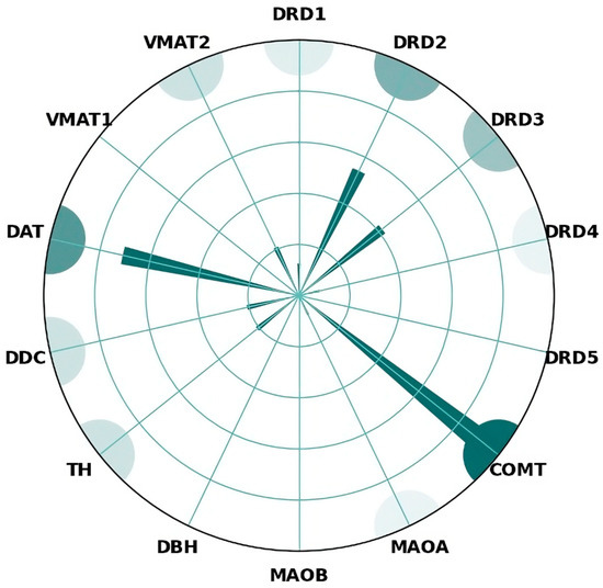 Polar bar chart of dopaminergic genes identified to participate in epistatic interactions. COMT, DAT, DRD2, and DRD3 emerged as the most influential in these interactive models. In contrast, no studies have identified significant epistatic associations involving DRD5, MAOB, DBH, or VMAT1. An interaction score is visually represented for each gene, where trend-level associations are given a lower weight but are still included in the overall aggregation.