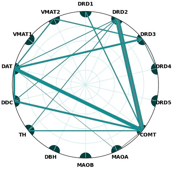 Out of the 14 genes surveyed, significant epistatic interactions frequently implicated COMT, SLC6A3 (DAT1), DRD2, and DRD3 (Figure 2); furthermore, rs4680, rs6347, rs1800497, and rs6280 were involved in more than one interaction. While the total number of possible combinations would be 91, only 15 appear potentially of interest, out of which only COMT–DRD2, COMT–DAT, COMT–TH, and DRD3–DAT have significant interactions in more than one study (Figure 3).