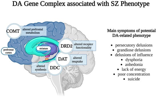 While the functional mechanisms are unclear, a DA gene complex may be associated with certain SZ symptoms, hinting at the idea that DA-associated SZ may represent one out of many different phenotypes. The complex consists of COMT (mainly expressed in the prefrontal cortex), DRD2 (mainly expressed in the striatum, olfactory tubercle, and nucleus accumbens), DAT (substantia nigra, ventral tegmental area, striatum, and nucleus accumbens), and DDC (hypothalamus, striatum, and locus coeruleus) [112].