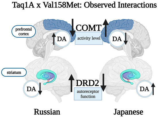 This review highlights two potential interactive effects of the COMTxDRD2 gene combination. The Japanese population (illustrated on the right) appears vulnerable to high COMT activity in the prefrontal brain (associated with the Val/Val genotype), combined with lower DRD2 receptor availability (associated with the A1 variant). This is functionally translated by lower prefrontal dopamine levels and higher striatal DA activity. The opposite effect may appear in Russians, however (left side), where lower COMT activity and higher DRD2 autoreceptor function led to higher prefrontal DA and lower striatal DA levels, and appear to represent a risk pattern [112].