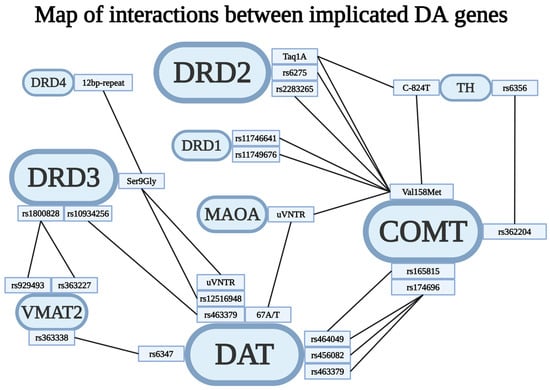 The COMT Val158Met polymorphism stands out, being involved in almost all identified gene–gene interactions, and two of the studies included incriminated the combination of DRD2 Taq1A (rs1800497) and COMT Val158Met (rs4680), functionally translated by low DRD2 density and rapid prefrontal dopamine degradation.