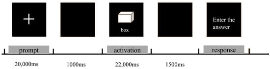 The Alternative Uses Task (AUT) assesses the subjects’ ability to generate novel and practical uses for an item within a limited time frame. In order to increase the process of refinement and evaluation of the subjects’ creative thinking process, the subjects were asked in the instructions to think of as many creative uses as possible in the allotted time and finally choose to input one of the most original ideas [31,32]. The specific flow of the experiment was as follows: first, the gaze point ‘+’ was presented in the screen for 20,000 ms (prompt phase 1000–21,000 ms), followed by an empty screen for 1000 ms, and then a picture of an everyday object and its name (e.g., a cardboard box) was presented, and subjects were asked to think about as many creative uses for the object as possible The presentation time was 22,000 ms (Figure 2). When the time was up, the picture disappeared and an answer prompt was presented, in which subjects entered the most creative use they could think of and then pressed the ‘Enter’ key to move on to the next question, with an interval of 2000 ms. Before entering the formal experiment, subjects were required to complete a practice experiment to familiarise themselves with the rules and procedures of the task. In order to assess the originality of the subjects’ answers, we used the consensus assessment technique (CAT), in which four trained evaluators scored the originality of each answer on a five-point Likert scale, with a score of 1 indicating “not at all original”, 2 indicating “not very original”, 3 indicating “generally original”, 4 indicating “fairly original”, and 5 indicating “highly original”. The originality score is the average of the scores of the subjects’ ideas on each topic.