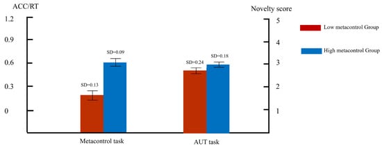 Performance ratio of high- and low-metacontrol groups in metacontrol tasks (ACC/RT) and novelty score in AUT tasks.