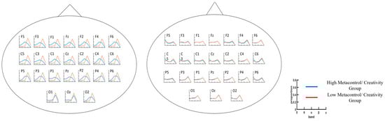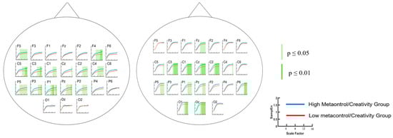 A three-way analysis of variance (ANOVA) was conducted with sample entropy (SampEn) as the dependent variable and metacontrol group, electrode point, and time scale (SF) as the independent variables. The ANOVA results showed a significant main effect of electrode point (F(23, 19,200) = 73.2, p < 0.001, ηp2 = 0.08) and a significant main effect of group (F(1, 19,200) = 77.04, p < 0.001, ηp2 = 0.004); the main effect of SF was significant (F(15, 19,200) = 767.91, p < 0.001, ηp2 = 0.375), the interaction of group × electrode site × SF was not significant (F(345, 19,200) = 0.07), and the interaction of group × SF was not significant (F(15, 19,200) = 1.09, p = 0.358). The group × electrode site interaction was significant (F(23, 19,200) = 4.11, p < 0.001, ηp2 = 0.005), and the electrode site × SF interaction was not significant (F(345, 19,200) = 0.56). Unpaired t-tests were performed for the high/low-metacontrol ability groups under each electrode point, and the results of the metacontrol task showed a significant increase in multiscale entropy in parts of the central, parietal, temporal, and frontal lobes for the high-metacontrol group at higher time scales (Figure 4). Correlation analyses showed that metacontrol scores were significantly and positively correlated with SampEn values at multiple electrode sites (F4, Cz, C1, C2, C3, C4, C5, Pz, P1, P2, P3, and P5) (Figure 5). Spectral analysis of the data from each electrode point revealed significant differences between the two groups of subjects in the frontal, parietal, and temporal lobe regions, with the low-metacontrol group having a higher relative power of the beta band (13–30 Hz) than the high-metacontrol group (Figure 6).