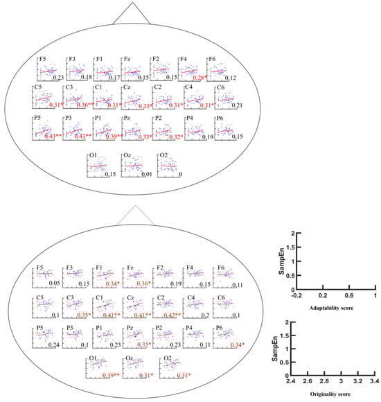 Pearson correlation between the adaptability score (top) and originality score (bottom) of the metacontrol task and multiscale entropy. (*) means p < 0.05, (**) means p < 0.01.