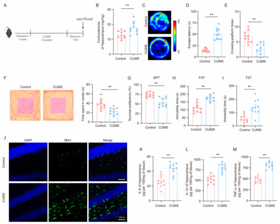 Chronic stress induces depressive-like behavior in mice and leads to the activation of neuroinflammation. (A) Schematic timeline of CUMS and behavior test. (B) Concentrations (ng/mg) of corticosterone in the hippocampus of control and stressed mice at the end of the CUMS procedure (n = 10, Student’s t-test, ** p < 0.01). (C) Representative track images of mice in the probe trial of MWM. (D,E) Escaping latency and crossing-platform times of mice (n = 10, Student’s t-test, ** p < 0.01). (F) Representative track images of mice in the Open Field Test (OFT) and time spent in the central (n = 10, Student’s t-test, ** p < 0.01). (G–I) Chronic unpredictable mild stress (CUMS)-induced depression-like behaviors were assessed by sucrose preference in the sucrose preference test (SPT) (G), immobility time in the forced swimming test (FST) (H), and immobility time in the Tail Suspension Test (TST) (I) (n = 10, Student’s t-test, ** p < 0.01). (J) Representative images of IF staining of hippocampal sections from control and CUMS mice. Iba-1, green; DAPI, blue. Scale bar, 50 μm. (K–M) Levels of IL-6, IL-1β, and TNF-α in hippocampus lysates from control and CUMS mice as determined by ELISA (n = 10, Student’s t-test, ** p < 0.01).