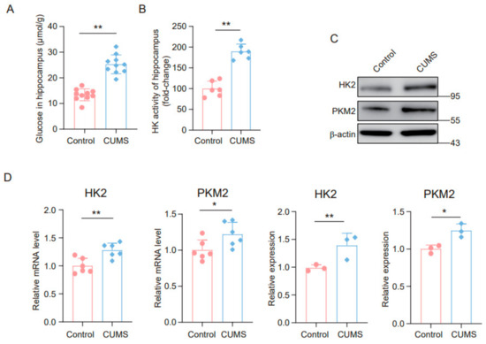 Chronic stress induces the upregulation of key enzymes of glycolysis in the mouse hippocampus. (A) Glucose levels in hippocampus lysates from control and CUMS mice (n = 10, Student’s t-test, ** p < 0.01). (B) HK activity in hippocampus lysates from control and CUMS mice (n = 6, Student’s t-test, ** p < 0.01). (C) Western blot of the expression of HK2 and PKM2 protein in hippocampus lysates from control and CUMS mice (n = 3, Student’s t-test, * p < 0.05, ** p < 0.01). (D) qRT-PCR assays monitoring the expression of HK2 and PKM2 in hippocampal lysates from control and CUMS mice (n = 6, Student’s t-test, * p < 0.05, ** p < 0.01).