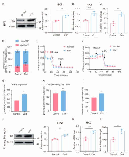 Exposure to high corticosterone promotes increased glycolysis in microglia. (A–J) Western blot of the expression of HK2 protein in BV2 and primary microglia cells lysates from control and Cort. Control cells were incubated with DMSO (n = 3, Student’s t-test, ** p < 0.01). (B,K) qRT-PCR assays monitoring the expression of HK2 level in BV2 and primary microglia cells incubated with Cort (50 µmol/L) for 24 h. (n = 3, Student’s t-test, ** p < 0.01). (C,L) HK activity in BV2 and primary microglia cells lysates from control and Cort (n = 3, Student’s t-test, ** p < 0.01). (D) Seahorse Extracellular Flux analysis to quantify ATP production in BV2 cells (n = 3, Student’s t-test, ** p < 0.01). (E–I) Treatment with Cort for 24 h significantly inhibited OCR in BV2 cells. Treatment with Cort for 24 h significantly increased glycolytic capacity of BV2 cells. Seahorse Extracellular Flux analysis to quantify basal and maximal respiration in BV2 cells. All the experiments were performed by the Agilent’s Seahorse Bioscience XF24 Extracellular Flux Analyzer. (n = 3, Student’s t-test, ** p < 0.01).