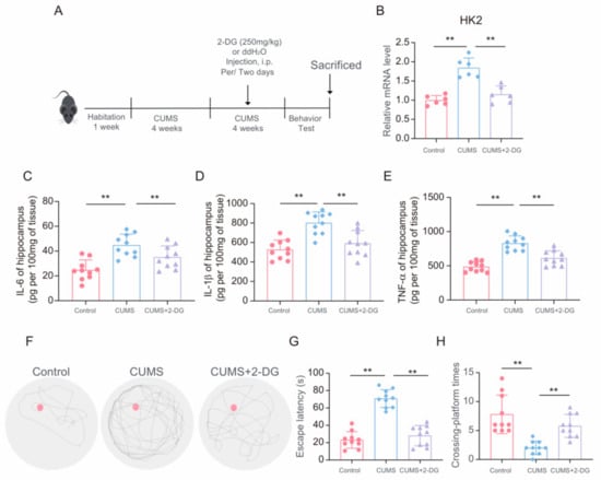 2-DG (MedChemExpress, Monmouth Junction, NJ, USA), acting as a glycolytic inhibitor, was utilized to explore the possible role of heightened glycolytic activity in cognitive decline caused by CUMS. Mice received intraperitoneal injections of 2-DG (250 mg/kg, diluted in ddH2O) every two days during the final phase of the CUMS protocol (weeks 5–8) [35]. The control group was injected with an equivalent volume of ddH2O.