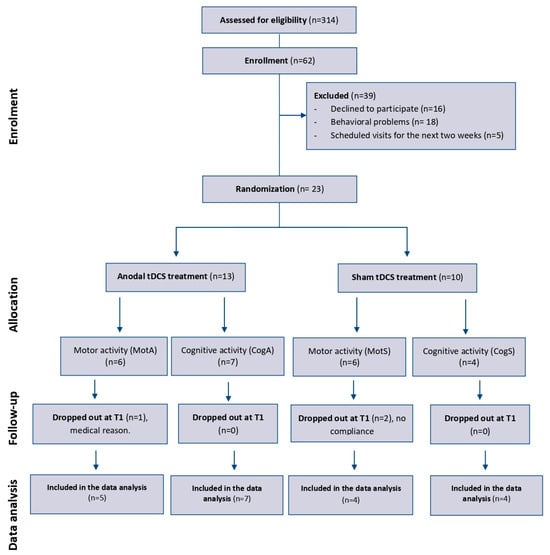 Twenty-three subjects (10 men and 13 women; mean age 83 years) presenting with AD (mean time since onset 3.4 years) were recruited from a total of 314 inpatients attending the Mons. A. Mazzali Foundation (Mantua) (Figure 1). They were randomized into four groups: two real tDCS groups (MotA group n = 6, CogA group n = 7) and two sham tDCS groups (MotS group n = 6, CogS group n = 4). Following the first assessment, there were three dropouts (MotA = 1, MotS = 2), which were not included in the data analysis and were, therefore, excluded from the research.