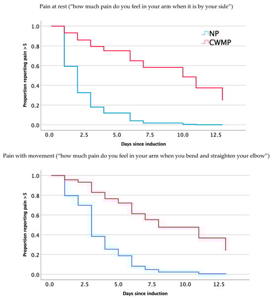 Data were downloaded from REDCap and cleaned in Excel before analysis in IBM Statistics (version 29). The peak pain intensity at rest and with movement, time to peak pain intensity (days), and time to recovery (defined as a VAS of <5 out of 100; days) were extracted. The peak pain at rest and with movement, and the time to these peaks were compared between groups using t-tests. The times to recovery were tested using Cox regression and Kaplan–Meier estimators.