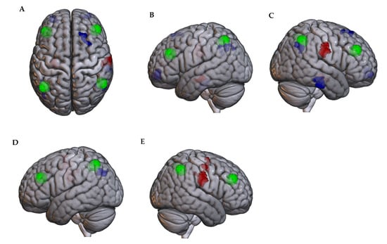 Clusters showing significant associations between connectivity with the FPN (green) and (A–C) the maximum pain at rest and (D,E) recovery time. Blue clusters show regions with negative correlation with SMN. Red clusters show regions with positive correlation with SMN.