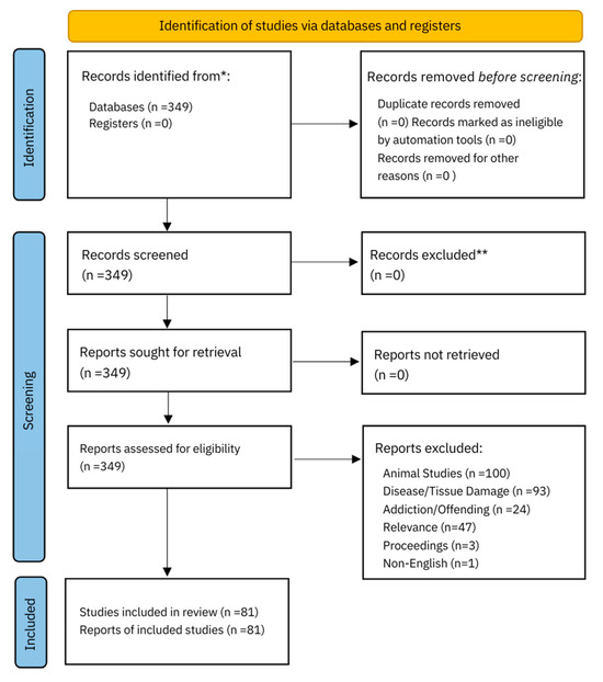 In total, 349 studies on conditions of central sensitization, the connectome, and sexual dimorphism were identified. After title, abstract, and full-text screening, 81 studies were identified as meeting the inclusion criteria.