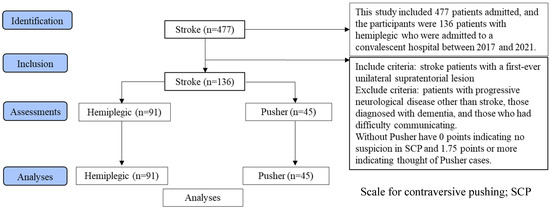 This study investigated 477 patients admitted to a convalescent hospital between 2017 and 2021, of whom 136 patients, including 91 patients with stroke hemiplegic and 45 patients with pusher behavior complicated by USN, were analyzed (Table 1). The inclusion criterion was stroke with the first unilateral supratentorial lesion. The exclusion criteria were progressive neurological diseases other than stroke, diagnosis of dementia, and the presence of communication difficulties. The study was conducted in accordance with the principles of the Declaration of Helsinki. An explanation of the study was provided to all patients, and informed consent was obtained via the opt-out method (no. Ryotokuji-00081). This study was approved by the University Hospital Medical Information Network Center (no. 000049806, approval on 31 March 2017), and all participants provided written informed consent.