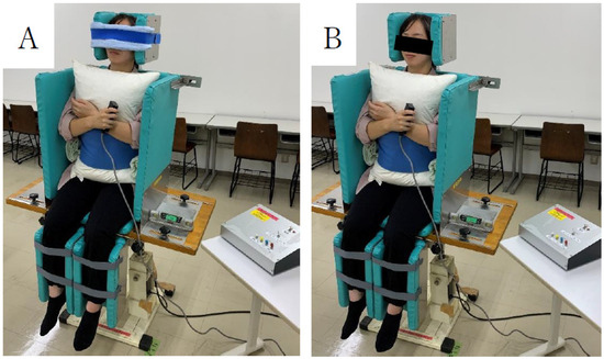 The SPV measurements were performed using a motorized tilt device. The mean of eight measurements was considered the directional error, while the standard deviation was considered the variability error (Figure 2) [20,21]. SPV was measured at the point where each participant was considered to sit vertically relative to the trunk line. The participants sat on the device and were inclined 15–20° to the left or right at a rate of 1.5° per second. The SPV measurements were performed in a randomized order. The starting direction of the tilt measurements was left or right based on the ABBABAAB or BAABABBA sequences. The standard deviation of the eight measurements was used as the PV tilt variability [20,21].