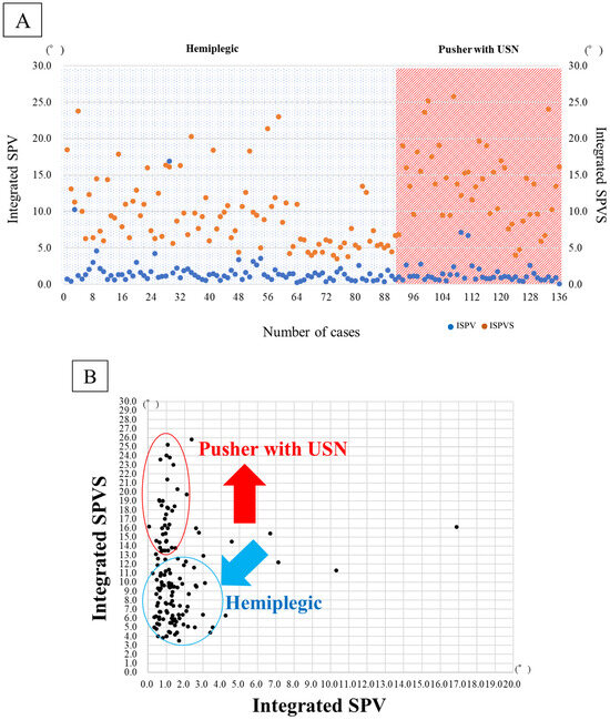 In Figure 3A, both hemiplegic and pusher cases show SPV deviations, and there seems to be no difference in visual modality compensation in ISPV. However, pusher cases are also complicated by somatosensory deficits, and since there is no difference in quotient, the sum is calculated as in ISPVS. The difference clearly appears to be magnified.