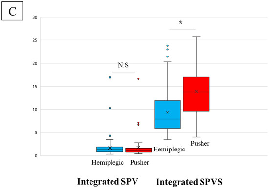 In Figure 3C, statistically significant differences are observed in ISPVS. This suggests that the effect of higher brain dysfunction on sensory integration is more pronounced in patients with pusher behavior than in hemiplegic patients with motor paralysis alone.