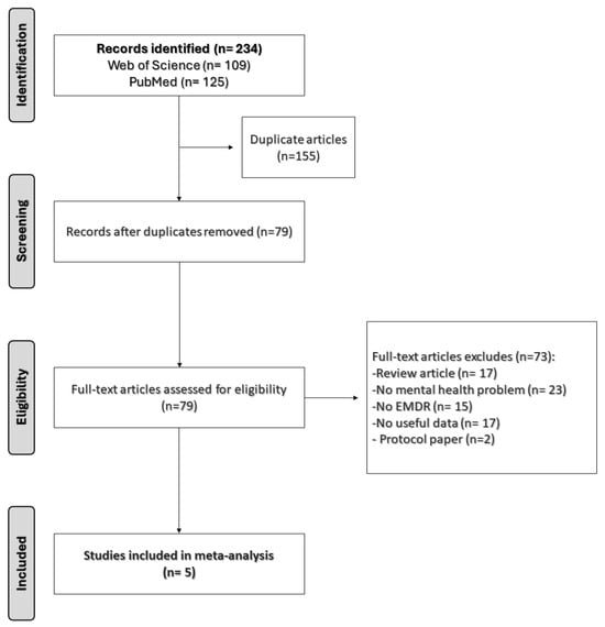 They were collected from previously published studies that obtained approval from ethical committees. Two independent authors (D.E.M.-F., A.P.G.-P.) searched the Web of Science and PubMed from database inception to 1 February 2024. The search strategy was crafted using a combination of Medical Subject Headings (MeSH) terms and various free-text keywords. Additionally, we enhanced our electronic database searches by reviewing reference lists from pertinent review articles and implemented a forward citation-tracking process for key papers in the field. The primary search was to identify articles that had used EMDR to treat patients with substance use disorder, specifically craving. Therefore, the search key words used were based on terms related to “EMDR” AND “Addiction” OR “Addicted” OR “Substance use” OR “Substance abuse”, OR “Drug” in the title, abstract or index term fields. The detailed search is shown in Table 1.