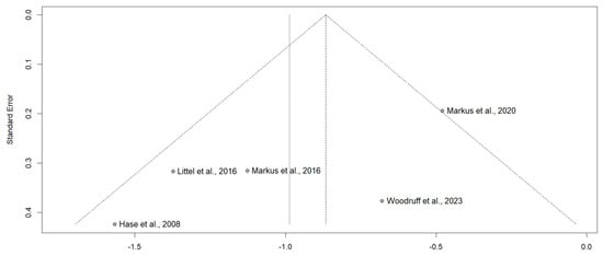 A sensitivity analysis was conducted sequentially excluding each individual study to evaluate their impact on the combined effect size. The findings indicated that the overall effect size remained relatively stable with individual study effect sizes varying between SMD = −0.7633 and −1.1805. This consistency supports the robustness and dependability of the meta-analysis results.