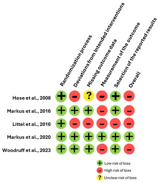 The funnel plot analysis revealed three studies positioned in the lower left quadrant and two studies in the right quadrant, suggesting some degree of symmetry; see Figure 3. However, given the small sample size of only five studies and their moderate heterogeneity, the risk of false positives in the meta-analysis is elevated, which can impact the interpretation of the funnel plot’s symmetry. Furthermore, the Rob-2 assessment indicated that most studies have a high risk of bias, which adds another layer of complexity to the findings; see Figure 4.