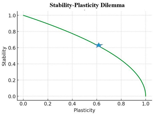 Figure 1 illustrates the fundamental trade-off between stability (the ability to retain existing knowledge) and plasticity (the capacity to acquire new information) in learning systems. The x-axis represents increasing plasticity from left to right, while the y-axis represents increasing stability from bottom to top. This Pareto Frontier Graph shows the optimal trade-off between stability and plasticity. The curve indicates the efficient frontier where improvements in one dimension lead to compromises in the other.