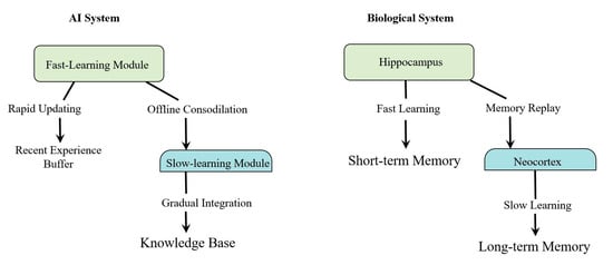 The key to both systems lies in the delicate balance between rapid acquisition and gradual consolidation. Memory consolidation–whether between the hippocampus and neocortex in biological systems or between fast and slow-learning modules in AI systems–ensures that new information is meaningfully integrated without disrupting existing knowledge. This parallel organization reveals how artificial systems have been designed to emulate the time-tested architecture of biological learning.