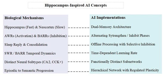 To visually summarize the key concepts discussed in this section, Figure 3 illustrates the parallels between biological mechanisms in the hippocampus–cortex system and their potential AI implementations.