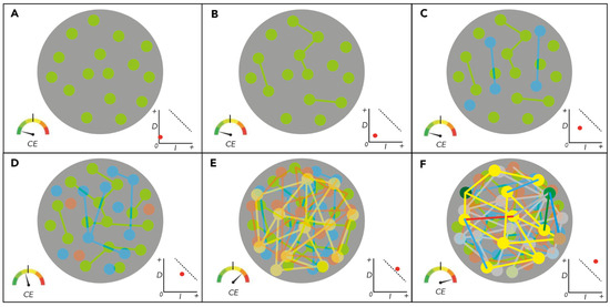 Illustration of a nervous system evolving from non-conscious to conscious states. In this highly simplified scale free model, panel (A) shows a material system, such as a nervous system, indicated by the grey circle that consists of several differentiated subsystems in which biophysical work is being performed, indicated by the green dots. As this energy processing is not dynamically integrated, the system is far below the threshold sufficient for conscious experience, indicated by the black bar on the meter labelled CE in the lower left of the panel. The graph in the bottom right of the panel plots as a red dot the relationship between the amount of differentiation (vertical axis) and integration (horizontal axis) in the system, and the threshold of sufficient differentiation and integration for conscious experience is indicated by the dashed slope. In panels (B–D), the level of activity and the amount of differentiation and integration are indicated by the lines, and the system gradually increases as different layers of subsystems, indicated with different colors, work, and interactions. But the threshold for conscious experience is not reached. In panel (E), the levels of activity and amounts of dynamic differentiation and integration in the system produce conscious experience, as indicated by the meter and the graph. In panel (F), a different pattern of subsystem activity is integrated in a different way from panel (E), which represents a different conscious experience for the system overall. Moreover, the increased vividity of the colors that represent the subsystems and their interactions in panel (F) and the more highly integrated and differentiated interactions between different layers of the subsystems indicate that greater quantities of more complex work are being carried out; the conscious experience is therefore more intense and richer than that in panel (E).