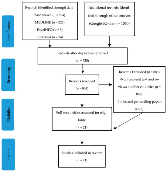 A systematic search in Embase, PsycINFO, and PubMed identified n = 21 relevant research articles from December 2023 to March 2024. The electronic search was initially performed using the following terms: ‘financial capacity’, ‘Greece’, ‘older adults’, ‘patients’, ‘neurocognitive’, ‘disorder’, ‘healthy’, and ‘abuse’. The extensive search was filtered for records published after 2000, and only peer-reviewed papers published in journals with official impact factors (IF) were examined for inclusion. All records were screened by title and abstract, and if judged as possibly eligible they were examined on a full-text basis by the researcher. In addition, the reference lists of the included articles were manually cross-referenced in order to identify any additional relevant articles. The inclusion criteria for the studies were as follows: published after 2010, being primary articles published only in journals with peer reviewers, examining healthy as well as older patients over the age of 65 years old, with or without a diagnosis of a medical disorder/NCD, and measuring financial capacity (not testamentary capacity) only in the Greek language/cultural context. The exclusion criteria were as follows: studies not published in English journals with IF and reviewers and those studies that did not meet the other inclusion criteria. A meta-analysis was not performed due to the heterogeneity of the studies (see Figure 1).