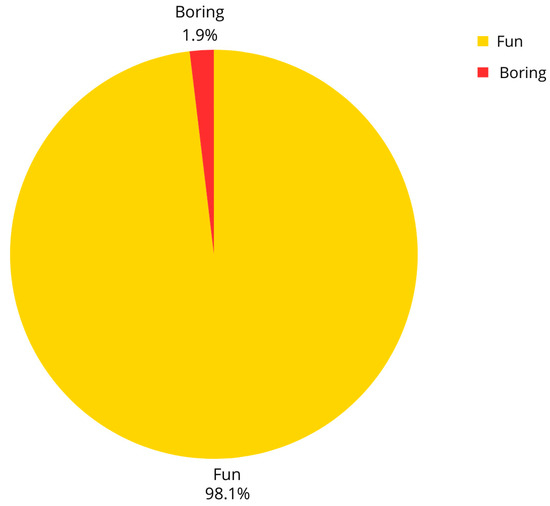 At the end of all sessions, children with ASD and non-autistic children completed an individual assessment of satisfaction. They were encouraged to describe their feelings about the session by selecting either a “fun” or “boring” image in a coloring activity. Out of a total of 210 evaluations (14 per child), 98.1% of the participants chose the “fun” option, indicating a high level of satisfaction, while 1.9% selected “boring”. These results showed a strong positive perception of the intervention with an overall satisfaction rate of 98.1% across all sessions (Figure 3).